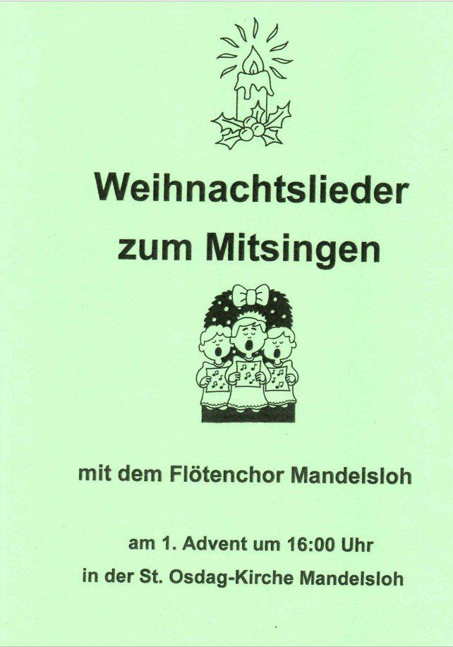 Der Weihnachtsmarkt findet wieder statt und wir laden Sie recht herzlich am 27.11.2022 um 16:00 Uhr in der Mandelsloher Kirche zum Mitsingen ein. Lassen Sie uns gemeinsam in vorweihnachtliche Stimmung "abtauchen".